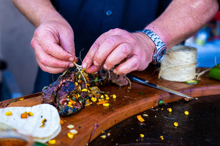 The cutting block, crafted by The RoseWood Block Company, is made from top-grade long grain cherry wood, known for its durability and elegant appearance. Its unique arched diamond shape perfectly matches the contours of the 30" Arteflame cooktop, providing an optimal surface for preparing and showcasing meats, poultry, and vegetables. It's also an ideal cheese board, adding a touch of class to your hosting.
